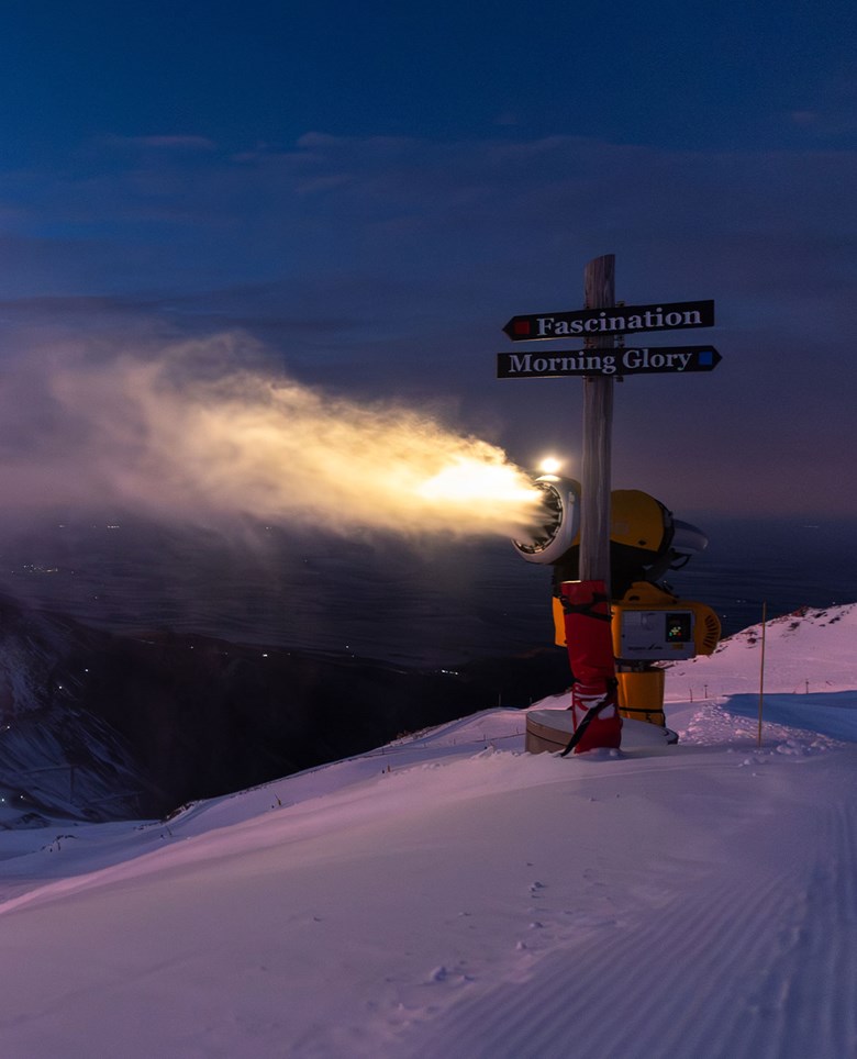 Our snowmaking machines are the best in the business meaning they're energy efficient when using both power and water to make snow. The water used is from our snowmaking reservoirs that are kept topped up via bores that tap into aquifers or streams that are fed by snow melt and run-off.